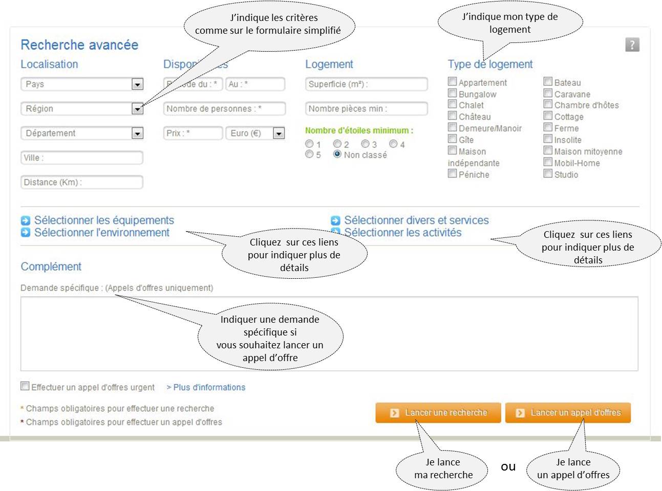 Deux possibilités s’offrent à vous pour effectuer la recherche de votre prochaine location de vacances : "Lancer une recherche" standard ou bien "Lancer un appel d’offre" :